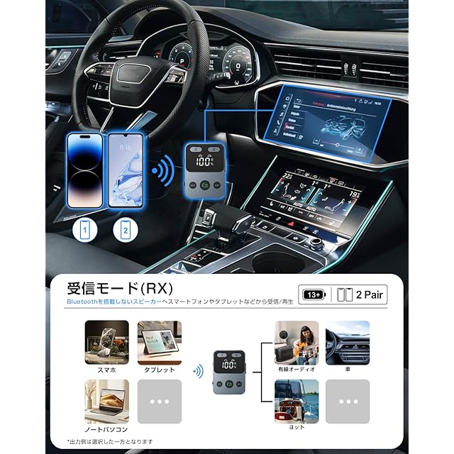 【受信機(レシーバー)モード】2台のスマートフォンやタブレットなどに接続可能、フル充電後、最大13時間連続使用可能てす。(*注意:2台目のスマホの音楽を再生したい場合は、現在のスマホの音楽を一時停止してから、再度クリックして2台目のスマホの音楽を再生してください。)