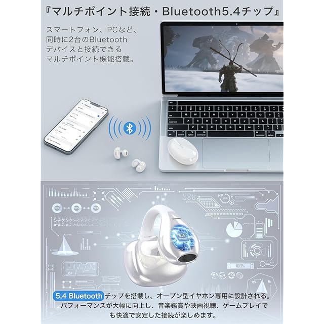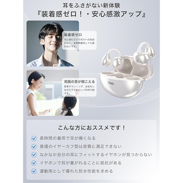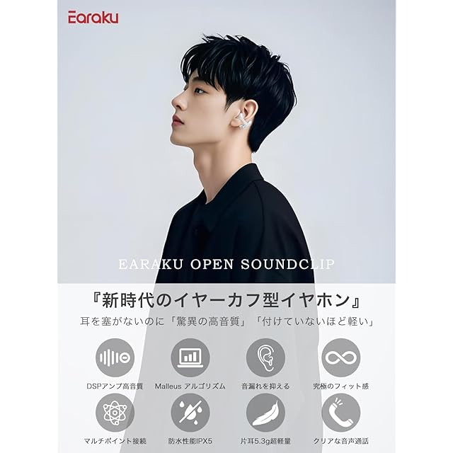 商品名:【音質至上主義・アクセ感覚のイヤーカフ型】 Earaku (イアラク) SoundClip ワイヤレスイヤホン オープンイヤー イヤホン イヤーカフ型 超軽量 耳を塞がない 耳挟み式イヤホン 音漏れ無し 骨伝導の革新 DSP機能 Malleusアルゴリズム オープンイヤーヘッドホン 業界トップ音質 48時間再生 Bluetooth5.4/マルチポイント接続/2025年新登場 (ホワイト)