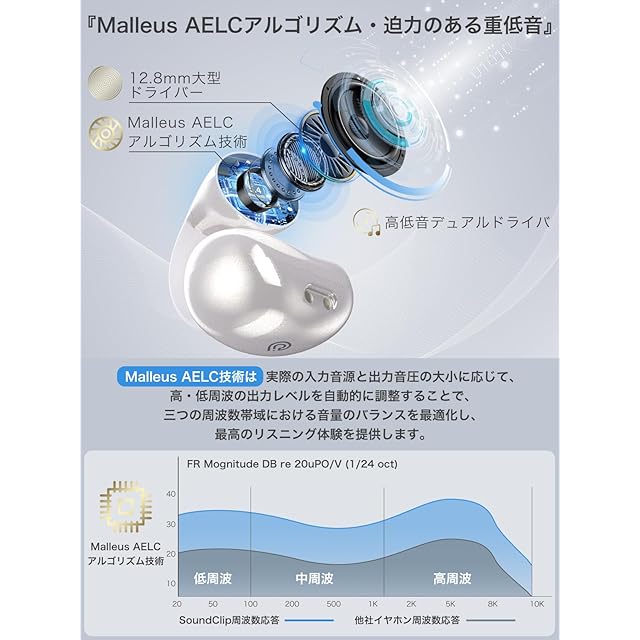 【Malleus AELCアルゴリズム技術・細部まで聴こえる音質】「SoundClip」OWSイヤホンが採用したMalleus AELCアルゴリズム技術は、実際の入力音源と出力音圧の大小に応じて、高・低周波の出力レベルを自動的に調整することで、三つの周波数帯域における音量のバランスを最適化し、最高のリスニング体験を提供します。「SoundClip」OWSイヤホンは12.8mm超大型ドライバーを搭載し、クリアな高音から自然に響く低音まで、あらゆる音域で豊かな音色を楽しめます。まるでライブ会場で聴いているような圧倒的な存在感のあるオーディオ体験を生み出します。膜の張ったようなこもりを感じることなく、没入感のあるHi-Fiサウンドをそのまま楽しめます。