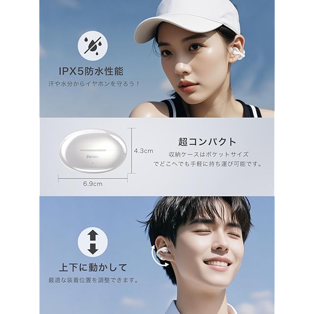 【IPX5防水仕様・スポーツシーンでも活躍】IPX5の防水機能を備えた「SoundClip」OWSイヤホンは、日常的な雨や汗に対して耐性を持ちます。これにより、ランニングやアウトドアでの活動など、激しい運動や湿度の高い環境でも安心して使用することができます。それに、湿った布での拭き取りなど、簡単なお手入れも可能です。*運動後に多量の汗をかいた際は、イヤホン表面の汗などを拭き取ってから、充電ケースに戻してください。