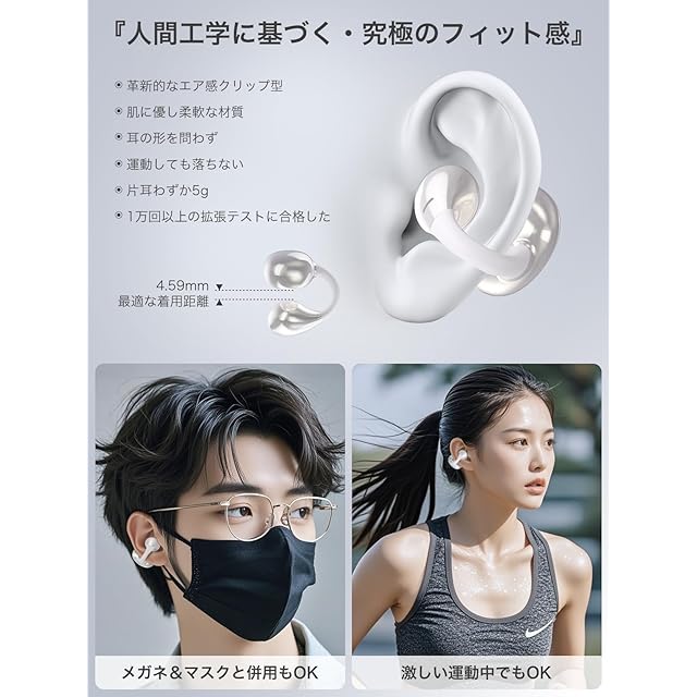 【装着感ゼロ!・動いても外れにくい】「SoundClip」OWSイヤホンはイヤカフ式にしております。C型ブリッジ部分に採用したニッケルチタン製形状記憶合金ワイヤーは、耐久性がありつつも高い弾力性を備えるため、さまざまな耳型にぴったりフィットします。また、イヤホンの重さは片耳わずか5.3gで、より軽やかでしっかりとしたフィット感を実現しました。テレワークで1日中装着していても、激しい運動時に付けっぱなしにしていても、自然なフィット感を保っております。「SoundClip」イヤホンはあなたの体の一部になることでしょう。