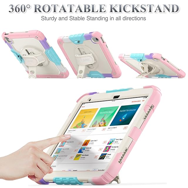 SEYMAC stock iPad(A16) 第11世代/第10世代専用ケース 耐衝撃 ペンホルダー フィルム付き前面カバー 横置き縦置きスタンド 360度回転ハンドストラップ ショルダーストラップ付き(色とりどりピンク) | TREND DESIGN 家電専門店