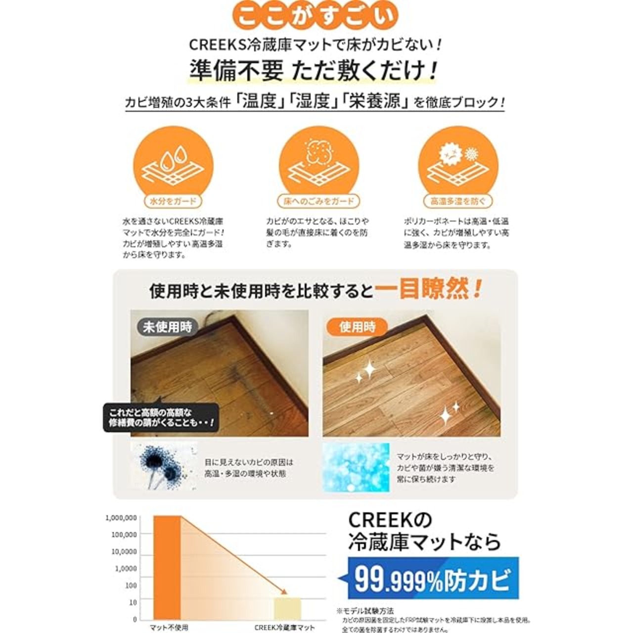✅【選ぶなら断然”ポリカーボネート”製!CREEK 冷蔵庫マット 】常識的に安すぎる類似品にご注意くださいCREEK(商標登録済み)冷蔵庫マットは、強度の強い” ポリカーボネート ”を採用しており、デスク マットで使用される安価なポリ塩化ビニル(PCV)製品とは耐久性、透明性など性能が大きく異なります。