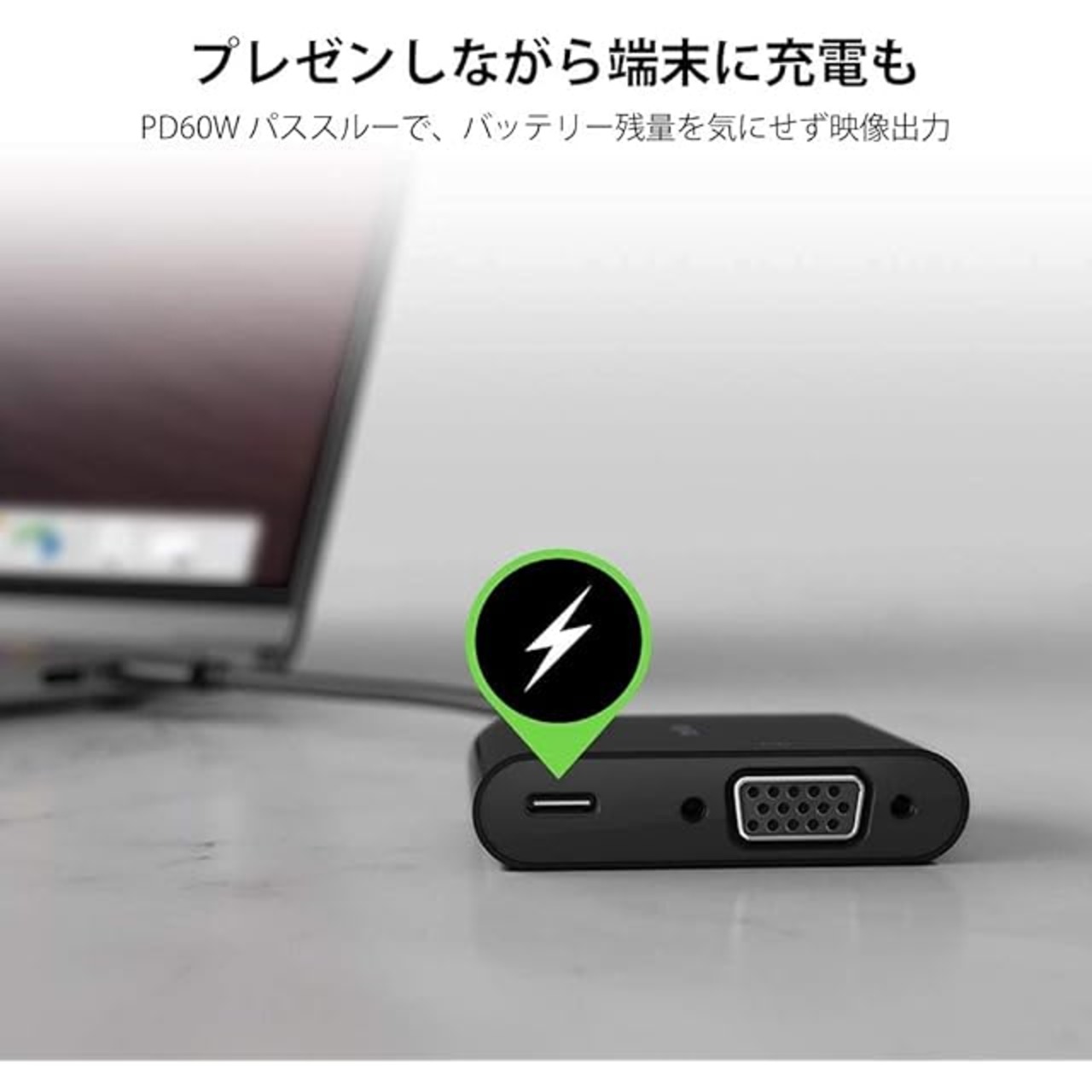 ノートパソコンやタブレットのUSB-Cポートに本製品のUSB-C端子(Thunderbolt 3ポート対応)を接続し、VGAポートにて最大1920x1200 (1080p)/60Hzで大画面モニターに映像出力し、同時にUSB-Cポートより最大60W給電が可能です。