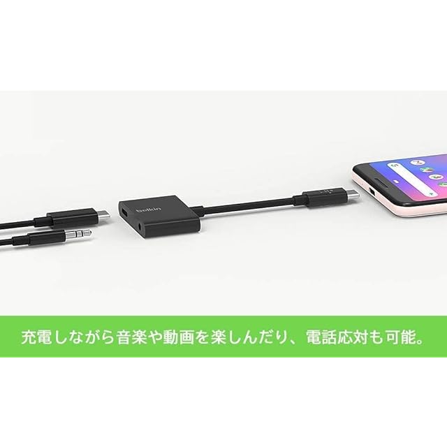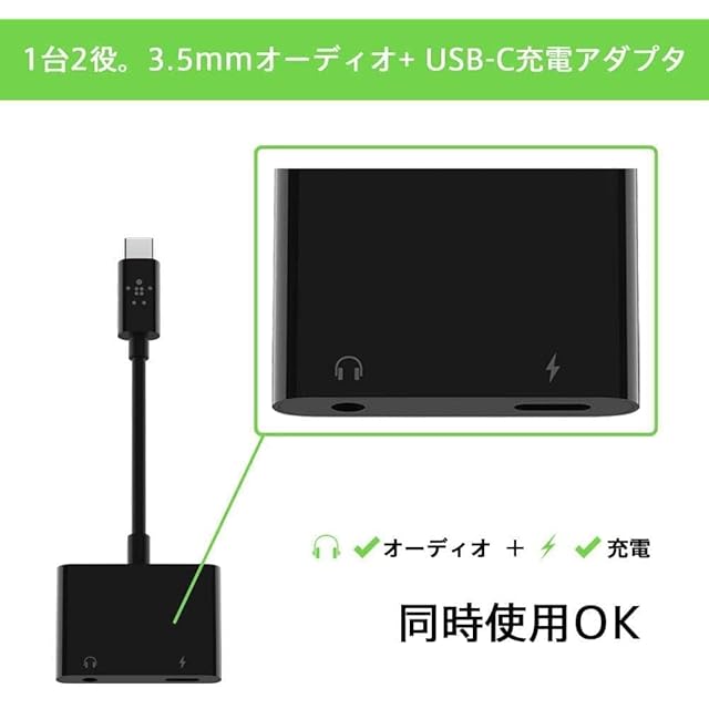 USB Type-Cを3.5mmオーディオとUSB-Cポートの二つに分岐し、スマートフォンやタブレットの充電とオーディオを同時に利用可能