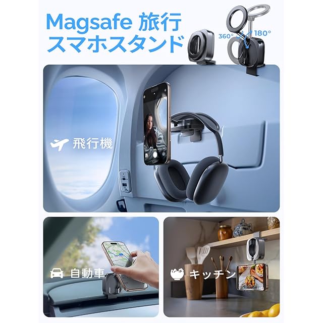 LISEN magsafe スタンド スマホスタンド 飛行機 旅行 便利グッズ ト スマホホルダー マグネット360°回転可能 iphone スタンド 飛行機 快適グッズ mag safe 新幹線 携帯ホルダースマホスタンド 卓上 旅行 片手操作 iPhone16 15 14 13 12 など全機種対応
