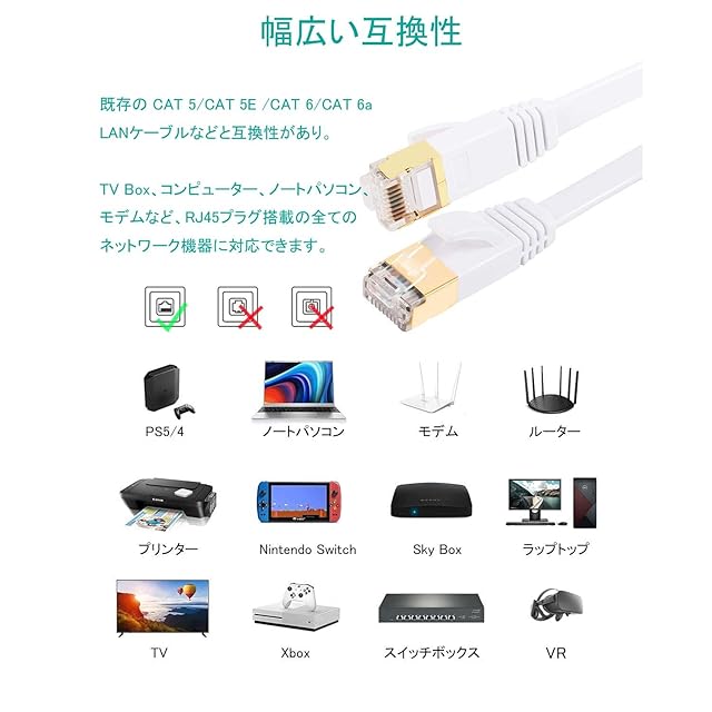 【幅広い互換性 & RJ45コネクター】高速Cat 7ネットワークケーブルは、Cat6a/ Cat6 / Cat5 / Cat5eケーブルと互換性があるだけでなく、ルータ、スイッチ、ハブ、TP-Link、TVボックス、TVデコーダー、WiFiルーター、PC、ネッ トワークプリンタ、Xbox、PS2、Smart TV、PS3、PS4、PS5などすべてのRJ45コネクタを搭載したデバイスにも適用します。