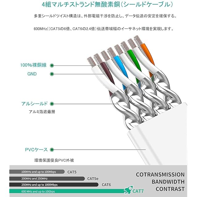 【通信安定】コネクタ部分には、錆や酸化被膜の発生を抑える金メッキを採用し、高精度の接触はいけます。4対8芯100%無酸素銅 、多重シールドツイスト構造は、外部電磁干渉を防止し、データ伝送の安定を確保する。屋外使用可能な難燃性、防水、耐久性、耐候性、日除け(対紫外線)の特徴を有しております。