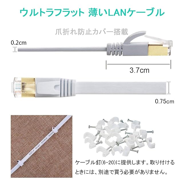 【フラット超薄型】薄さ2.1mmの超フラットで、カーペットの下や、細い隙間にスッキリ配線できます。CAT7イーサネットケーブルは超薄型技術採用し、もつれたコードを避けてスペースを節約し、敷物やカーペットの下でケーブルを配線しても目立たない、インテリア装飾の美観性を損ねない。ケーブルクリップが無料で同梱されます。