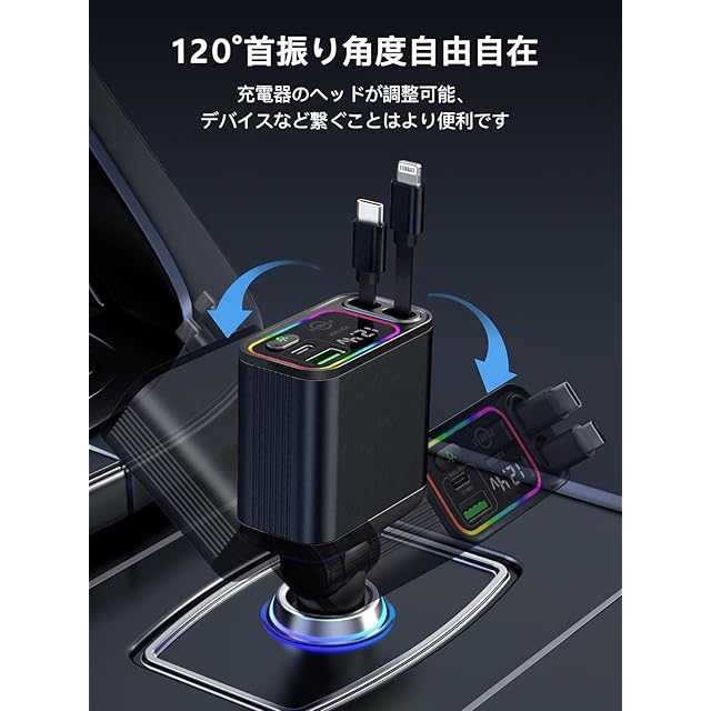 商品名:【2025新版 巻き取り式】4台同時充電 107W 車載充電器 シガーソケット USB 巻き取り式ケーブル2本(Type-C+Lightning)搭載 カーチャージャー 電圧計&レイボーンLED付き iPhone16/15/14 Galaxy Xperia iPad対応 車 充電器