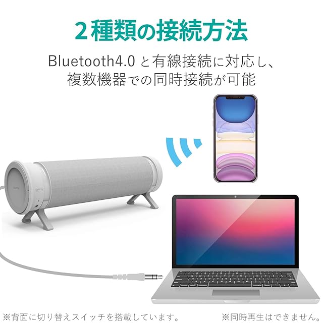音楽再生は有線(ステレオミニプラグ)接続とBluetooth(R)接続の両対応で、パソコンとスマートフォンなど複数の機器からの再生が可能です。※有線とBluetooth(R)の同時再生はできません。
