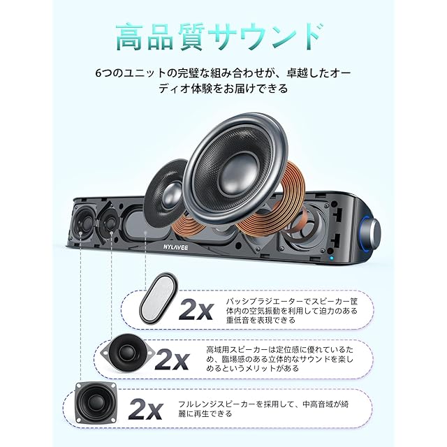 商品名:Nylavee PCスピーカー サウンドバー Bluetooth & AUX接続 六つのスピーカーユニット 10W ステレオ 大音量&豊かな低音 ラップトップ、タブレット、スマートフォンに対応、USB給電式のパソコンスピーカー