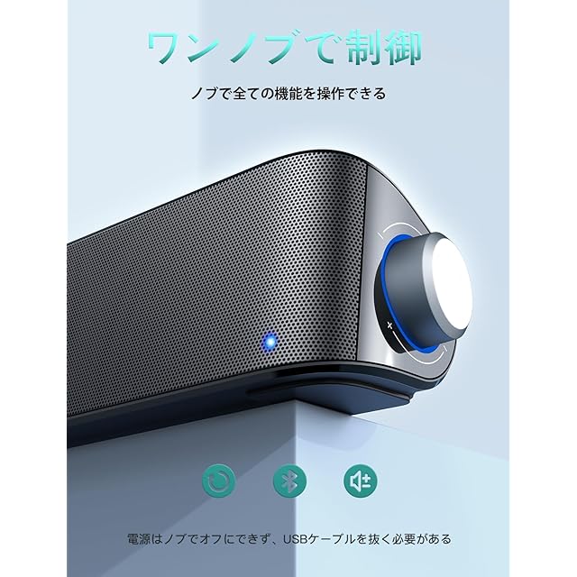 【USB給電&ワンノブ操作】 Nylaveeのサウンドバーには内蔵バッテリーはありません。USBケーブルを電源に接続し、自動的に電源がオンになります。一つのノブで音量調節や再生停止などの操作が可能です。