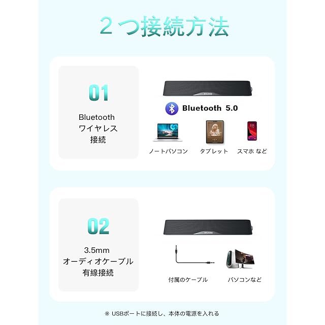 【2つの接続方法】 Nylavee PCスピーカーには、Bluetooth と3.5mmオーディオケーブルの2つ接続方法があります。ノートパソコン、デスクトップ、PC、携帯電話、タブレット、PS4など幅広いデバイスと互換性があります。
