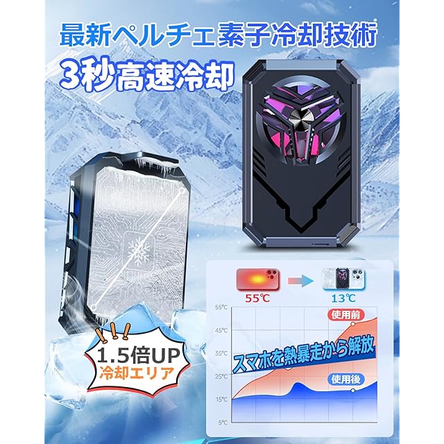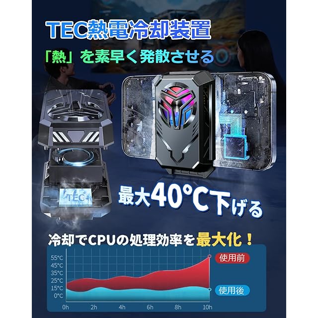 【スマホ急速冷却・3秒高速冷却】スマホの発熱で処理速度が低下するお悩みを解決するスマホ散熱器!接続するだけで即座に作動し、3秒でスマホの温度が明らかに下がります。ペルチェ素子を利用した強力な冷却効果で、バッテリーの劣化を抑え、スマホの性能を常に最適に保ちます。高負荷のゲームをプレイする時や長時間の生配信でも快適な体験を確保し、過熱の心配がありません!