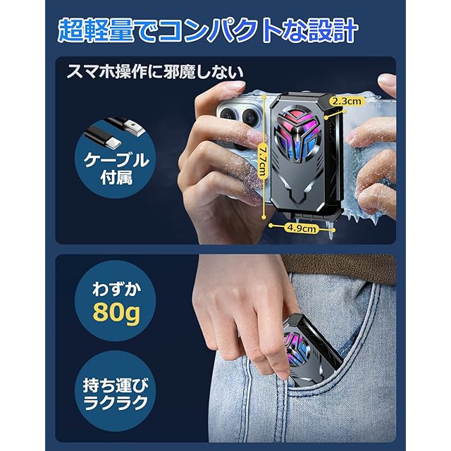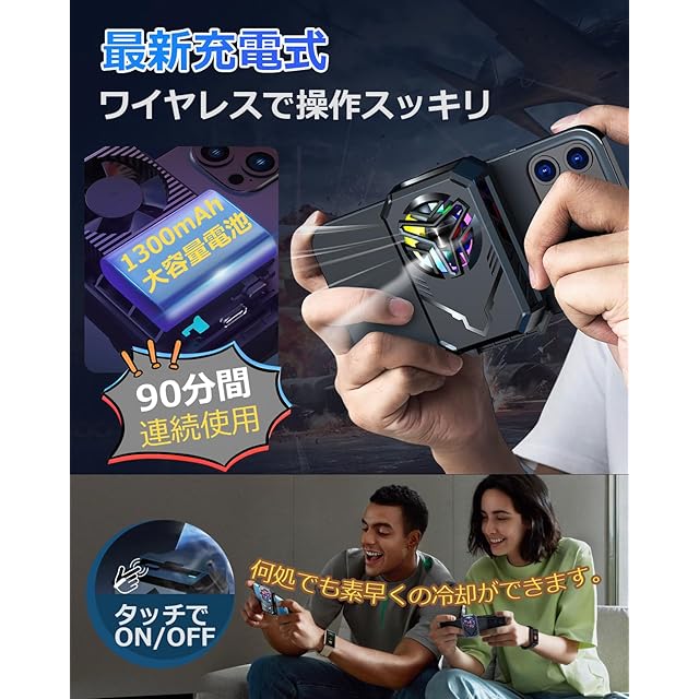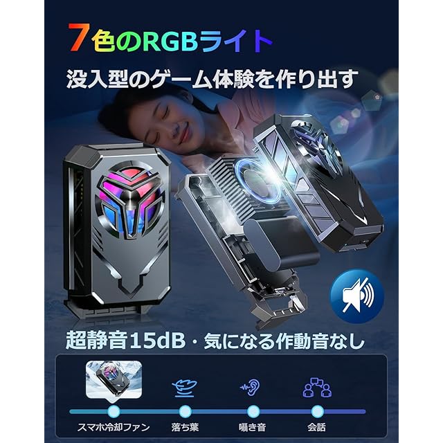 【高効率冷却・静音ファン設計】スマホ冷却ファンの裏面は高い熱伝導性を持つアルミ合金製の放熱板を採用し、発熱を効果的に吸収できます。7枚ブレードの静音ファンを搭載しているため、迷惑なノイズがなく、静かな場所でも安心して利用できます。