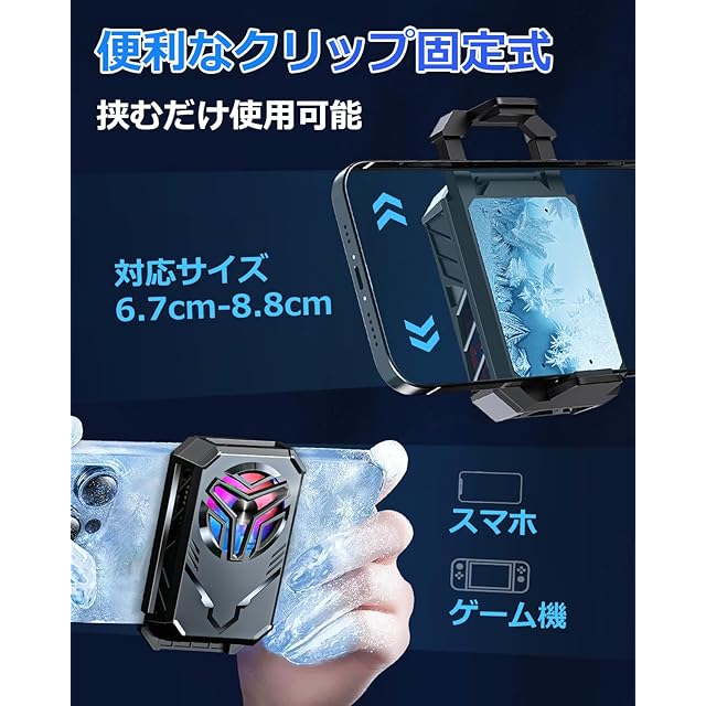 【磁気式&クリップ式2WAY設計】 4.7〜6.7インチのデバイスに適したクリップが装備されており、付属のマグネットリングで市販のAndroid、iPhone、iPadやケーム機にほぼ対応可能です。2WAYの取り付け方法で手軽に固定できます。スマホと密着できるので、より抜群の冷却効果を実現しました。※Mag-Safe機能があれば直接取り付けます。