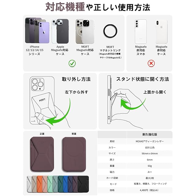 ✅【対応機種と注意事項】iPhone 16/15/14/13/12全シリーズに対応できます。または、MagSafe機能があるスマホケースやマグネットリングと併用することで使用可能です。*MOFT Snapケースと併用すれば、磁力がさらにアップ!