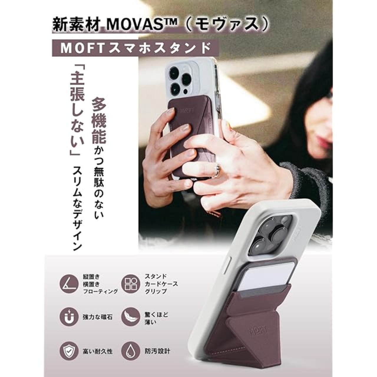 ✨【最新のヴィーガンレザー「MOVAS」採用!洗練されたスリムデザインで高耐久性】 「MOVAS」は、MOFTが誇りを持って開発したヴィーガンレザーで、その特長は一見の価値があります。この素材は驚くほど繊細な手触りを備えながら、同時に高い耐久性を持ち、さらには環境への優しさも追求しています。その結果、この素材を使用したスマホスタンドは、優れた張力と靱性を誇り、ポケットにキーホルダーやカードキーと一緒に収納しても傷がつきにくいのが特長です。洗練されたスリムデザインは、ユーザーに高級感をもたらし、日常のスタイリッシュな使い勝手を追求した結果として、このヴィーガンレザーのスマホスタンドは他と一線を画しています。