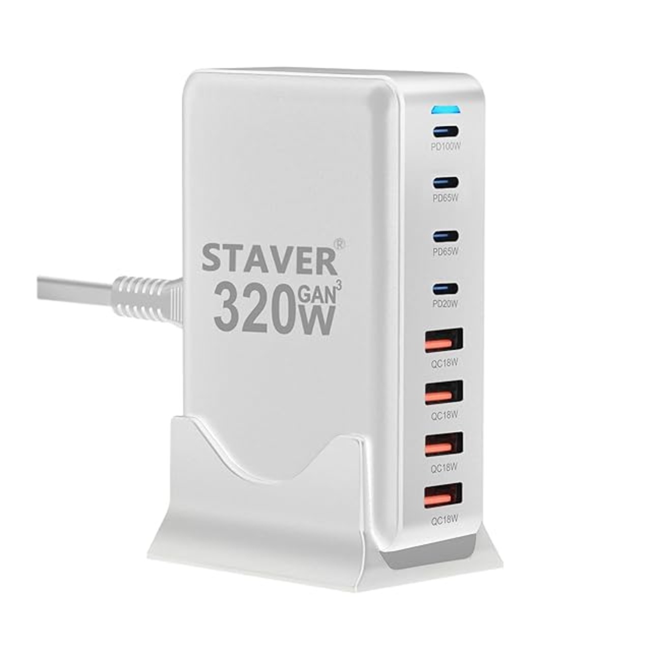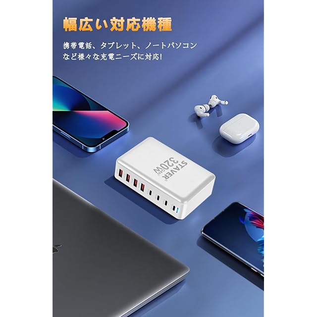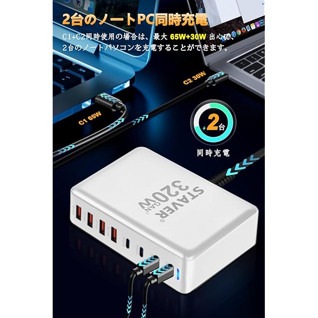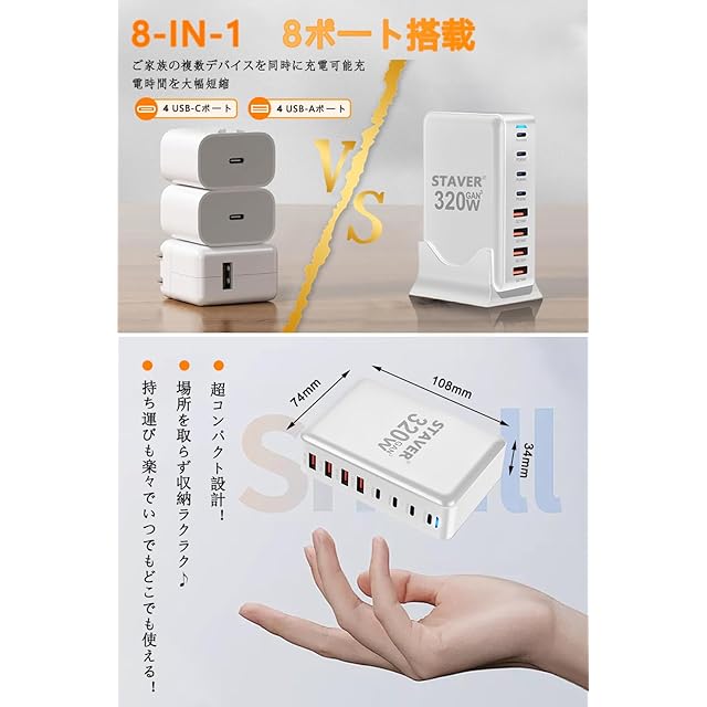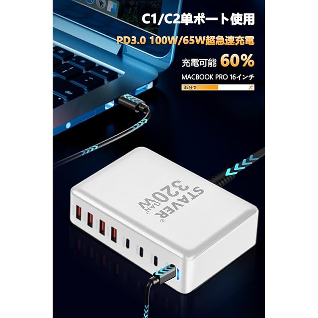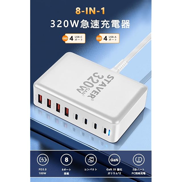 商品名:320W 充電器 【 GaNFastⅢ 8ポート 単口max 100W 1.5m電源ケーブル】 PD3.0対応【PSE技術基準適合】100W常時対応 8ポート1*100W&2*65W&4*QC18W 4 USB-C&4 USB-A 縦式省スペース ダブル 複数ノートPCに急速充電対応 MacBook Pro PD対応 iPad/iPhone/Android/その他 (ホワイト-320W)
