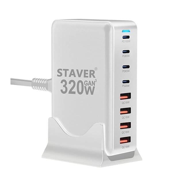 320W 充電器 【 GaNFastⅢ 8ポート 単口max 100W 1.5m電源ケーブル】 PD3.0対応【PSE技術基準適合】100W常時対応 8ポート1*100W&2*65W&4*QC18W 4 USB-C&4 USB-A 縦式省スペース ダブル 複数ノートPCに急速充電対応 MacBook Pro PD対応 iPad/iPhone/Android/その他 (ホワイト-320W)