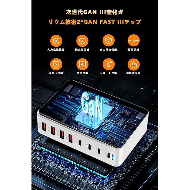 500W 充電器 【2024新登場 GaNFastⅢ 8ポート 2*単口100W 】 PD3.0対応 8ポート同時急速充電 2*100W&4*65W&2*QC20W 6 USB-C&2 USB-A 縦式省スペース ダブル GaNFastⅢ(窒化ガリウム) 2*100W常時対応 複数ノートPCに急速充電対応 MacBook Pro PD対応 iPad/iPhone/Android/その他