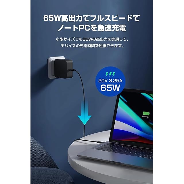 ➤【GaN +窒化ガリウム テクノロジー 】新世代のGaN窒化ガリウムが採用され、65Wの高出力しながら、従来のノートパソコン充電器やMacbook付属の純正充電器よりコンパクトなサイズを実現しました。小さいサイズでより高い効率的な充電電力、熱伝導率が大きく放熱性に優れて65Wフルスピード充電が可能です。