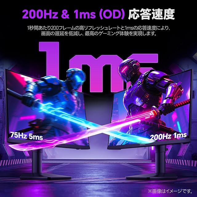 【200Hz高リフレッシュレート・1ms(OD)応答速度】最大200Hzリフレッシュレートに対応でき、1秒間あたり200枚の画像表示と1ms(OD)高速応答速度で、FPSや格闘ゲームの高速動作もなめらかに再現、より滑らかでスムーズな映像をお楽しめます。Adaptive Syncテクノロジーも対応(FreeSync&G-Sync対応)で、画面のティアリングやスタッタリングを解消できて、ゲーミングモニターとして圧倒的なゲームプレイを与えられます。