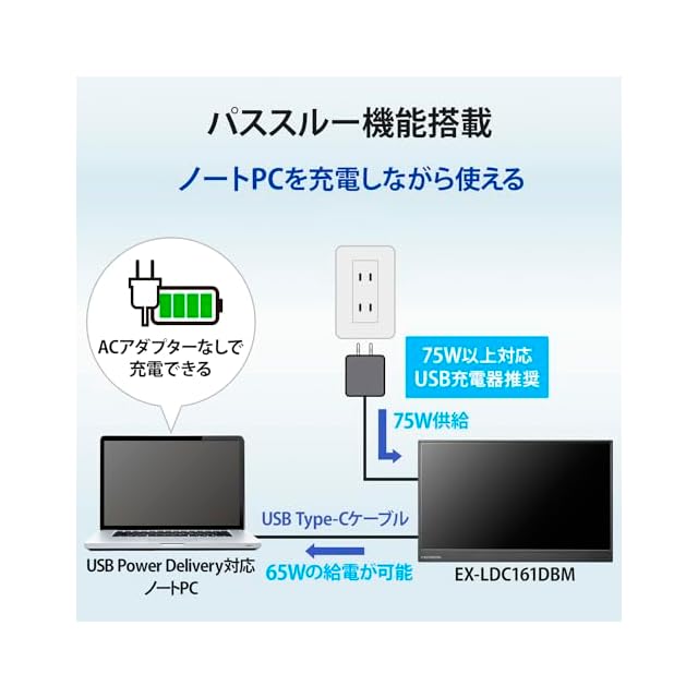 【USB Type-C採用! ケーブル1本でPCと接続できる! 】「USB Type-Cディスプレイ給電」に対応しているので、添付しているUSB Type-Cケーブルで接続することにより、パソコンからの映像出力と給電がケーブル1本で行われます。電源コンセントに繋ぐ必要がないため、どこでも好きな場所でお使いいただけます。また、専用ドライバーも不要で購入後すぐにお使いいただけます。※パソコンに映像出力(DisplayPort Alt Mode)対応のUSB Type-C ポートが必要です。※給電が足りない場合は付属のACアダプターをご使用ください。