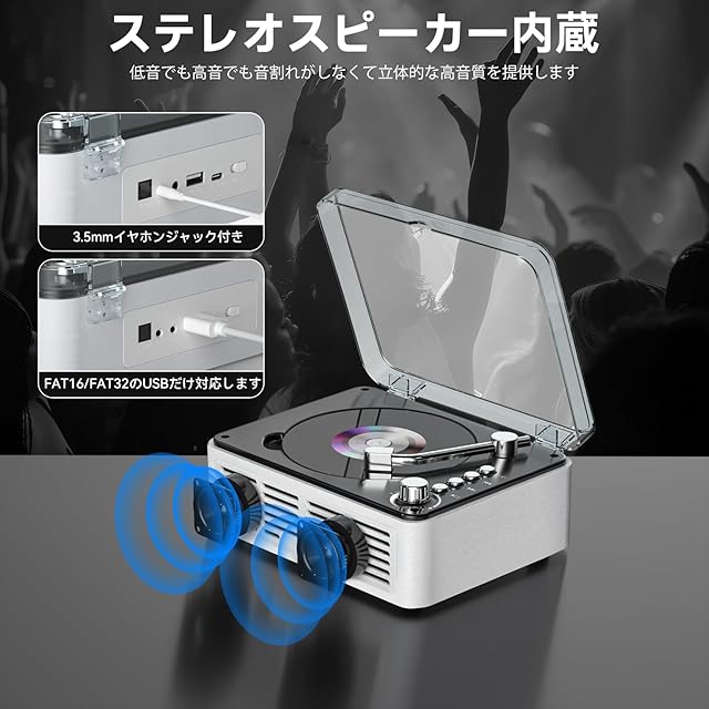 「ステレオスピーカー内蔵&3.5mmイヤホンジャック付き」本CDプレーヤーは3.5mmイヤホンジャック付き、別売りの3.5mmイヤホンを支持するほかに、内蔵のステレオスピーカーを搭載しており、低音でも高音でも音割れがしなくて立体的な高音質を提供する可能のですぐに空間内に音楽を溢れさせます。