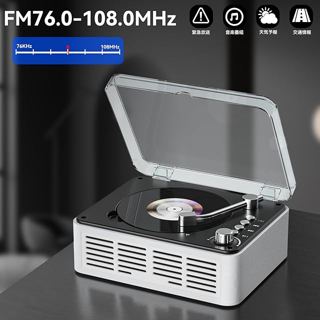 「シンプルなデザインで使いやすいCDプレーヤー」レトロでシンプルなデザインを持ったこの卓上置き式のCDプレーヤーは使いやすい、防塵用の透明カバーを付き、飾りの同時にレーザー素子とCDが壊れられないために粉塵を入るのを防ぎます。また、付きのリモコンを使って簡単に接続と再生モードの変換、FMラジオ局の検索と再生、Bluetooth発信、CDの早送りとはや戻り、選曲など機能ができます。便利に操作すると同時に典雅な雰囲気を増やします。ご注意:リモコンの利用範囲は6mです。