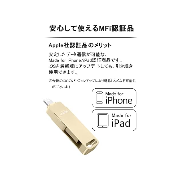 「安心して使えるMFI認証iPhone usbメモリ」当社のusbメモリはApple社のMFi認証取得を取得、認証番号。Made for iphone/ipad認証Lightning USBメモリは安定したデータ通信が可能で 、IOSを最新版にアップデートしても、引き続き使用出来ます。
