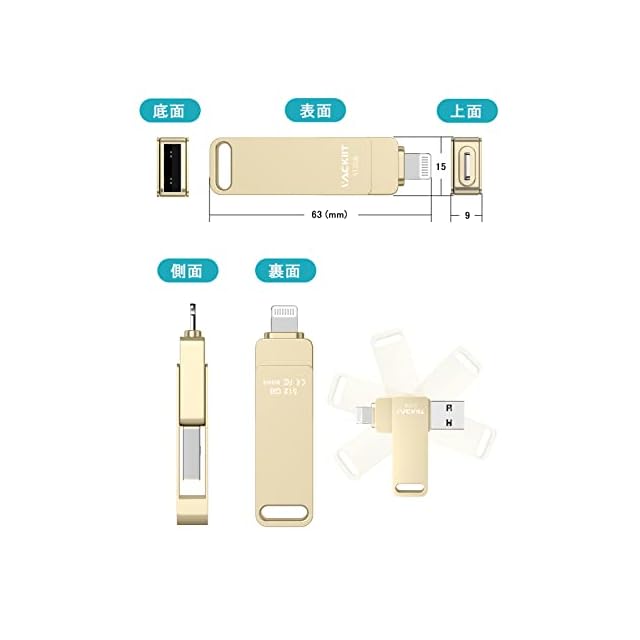 商品名:Vackiit「Apple MFi認証取得」iPhone用 usbメモリusb iphone対応 Lightning USB iPhone用 メモリー iPad用 フラッシュドライブ usbメモリ lightningコネクタ搭載 外付 容量不足解消i Phone/iPad/iPod/Win/Mac兼用 (金, MFI 認証済み 512GB)