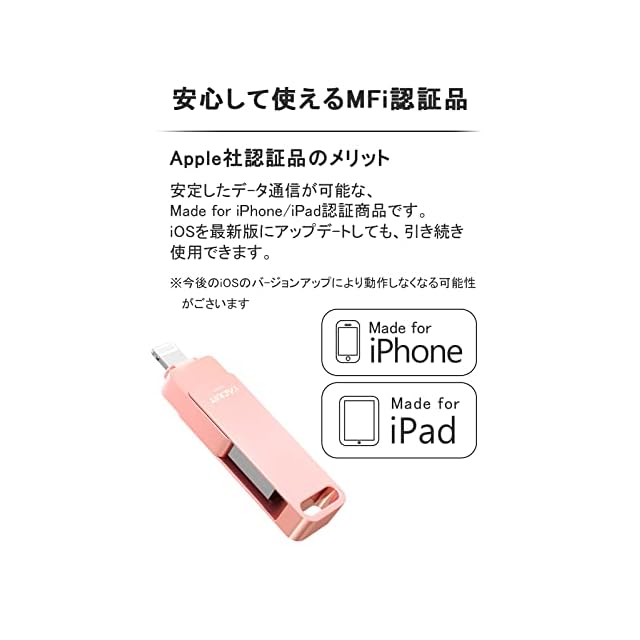 商品名:Vackiit「Apple MFi認証取得」iPhone用 usbメモリusb iphone対応 Lightning USB iPhone用 メモリー iPad用 フラッシュドライブ usbメモリ lightningコネクタ搭載 外付 容量不足解消i Phone/iPad/iPod/Win/Mac兼用 (ピンク, MFI 認証済み 128GB)
