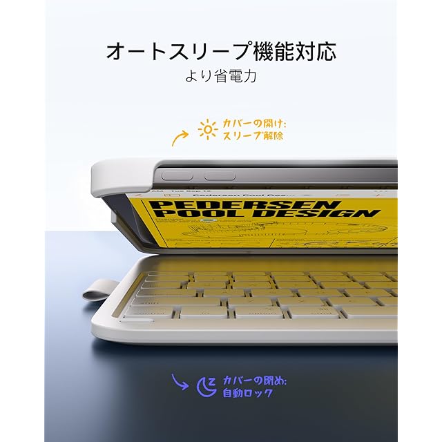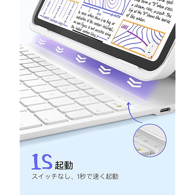 1秒起動:1秒未満でオンになります。iPadを立ち上げるとキーボードが自動的に電源が入ります。iPadを持ち上げるとキーボードの電源が自動的にオフになります。物理スイッチなしでより手間なく省電力です