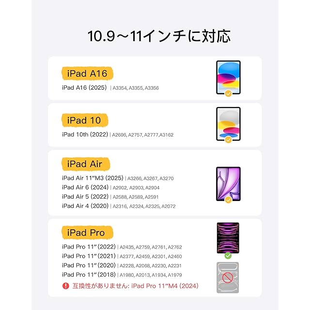 対応機種:当商品は、11インチiPad A16 第11世代2025/10.9インチiPad 第10世代2022、11インチiPad Pro 第4/3/2/1世代、iPad Air 11インチ M3 2025/M2 2024、iPad Air 第5世代/第4世代に特別に設計されています
