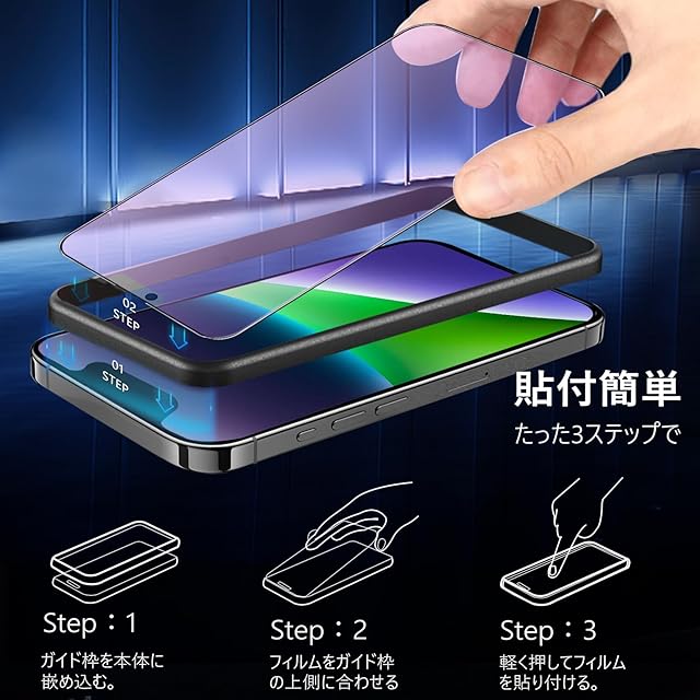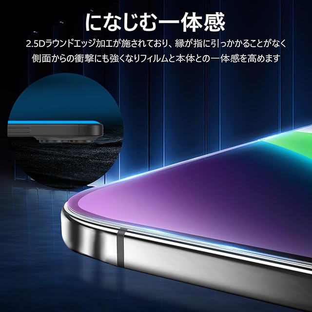 【ガイド枠付き・貼付け簡単】ガイド枠をはめる→上側に合わせて、14Plusフィルム を置く→軽く押すだけで自然に吸着。フィルム貼りことが苦手の方でも簡単に貼る事が可能です。また、縁にラウンドエッジ加工が施されており、iPhone本体の縁に適度なスペースを残すデザインとなっており、14Plus フィルム の剥がれや浮き上がりを防止し、スマホケースと干渉せずに快適に使えます。