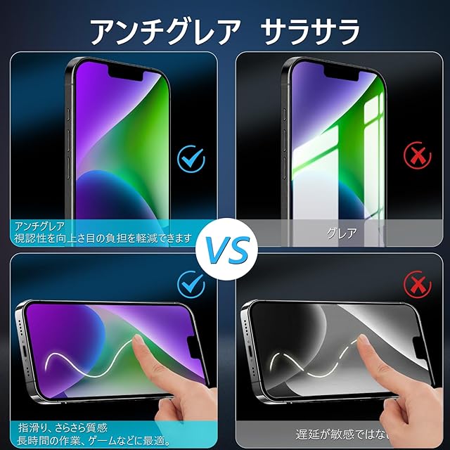 【アンチグレア・指紋防止・高感度タッチ】アンチグレア(非光沢)タイプのさらさらで快適な操作感。光の反射を軽減し、より目に優しくちらつきを抑えます。同時に、iPhone14プラスガラスフィルム には撥油コーティングが施されており、指紋が目立ちにくくなって、付着した汚れなどは簡単に拭きとれます。さらさら質感で指滑りもよく、長時間の作業、ゲームなどに最適。