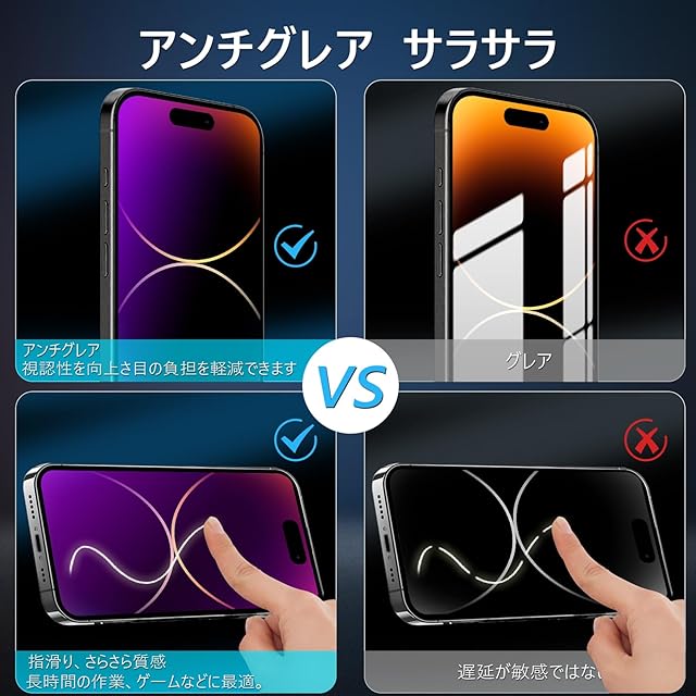 【アンチグレア・指紋防止・高感度タッチ】アンチグレア(非光沢)タイプのさらさらで快適な操作感。光の反射を軽減し、より目に優しくちらつきを抑えます。同時に、iPhone14プロガラスフィルム には撥油コーティングが施されており、指紋が目立ちにくくなって、付着した汚れなどは簡単に拭きとれます。さらさら質感で指滑りもよく、長時間の作業、ゲームなどに最適。