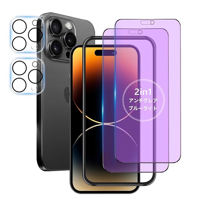 【ブルーライトカット + アンチグレア/2枚セット】 iPhone14Pro ガラスフィルム ブルーライト さらさら iPhone 14 Pro フィルム ブルーライトカット サラサラ アイフォン14プロ 保護フィルム 指紋防止 いPhone 14Pro 用 強化ガラス 画面フィルム iPhone14Pro カメラフィルム 付き