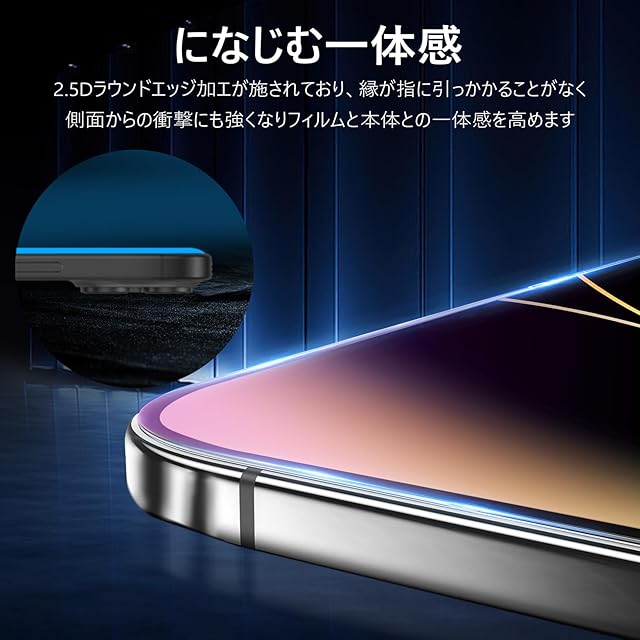 【ガイド枠付き・貼付け簡単】ガイド枠をはめる→上側に合わせて、14Proフィルム を置く→軽く押すだけで自然に吸着。フィルム貼りことが苦手の方でも簡単に貼る事が可能です。また、縁にラウンドエッジ加工が施されており、iPhone本体の縁に適度なスペースを残すデザインとなっており、14Pro フィルム の剥がれや浮き上がりを防止し、スマホケースと干渉せずに快適に使えます。