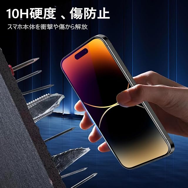 【10H硬度・高品質素材】MINIKAの いPhone 14 Pro ガラスフィルム、10H硬度ガラスを採用し、ハードコーティング技術により外部からの衝撃を吸収し、画面へのダメージを可能な限り抑えます、スクラッチ防止。【製品の特徴】 全面保護/気泡なし/耐衝撃/剥がれない/綺麗/飛散防止。