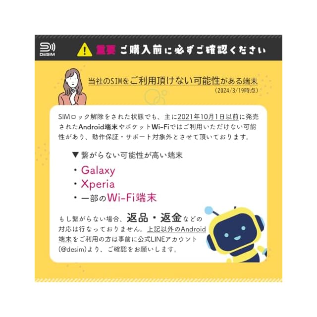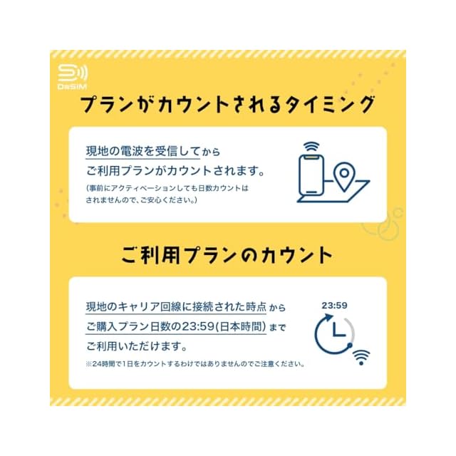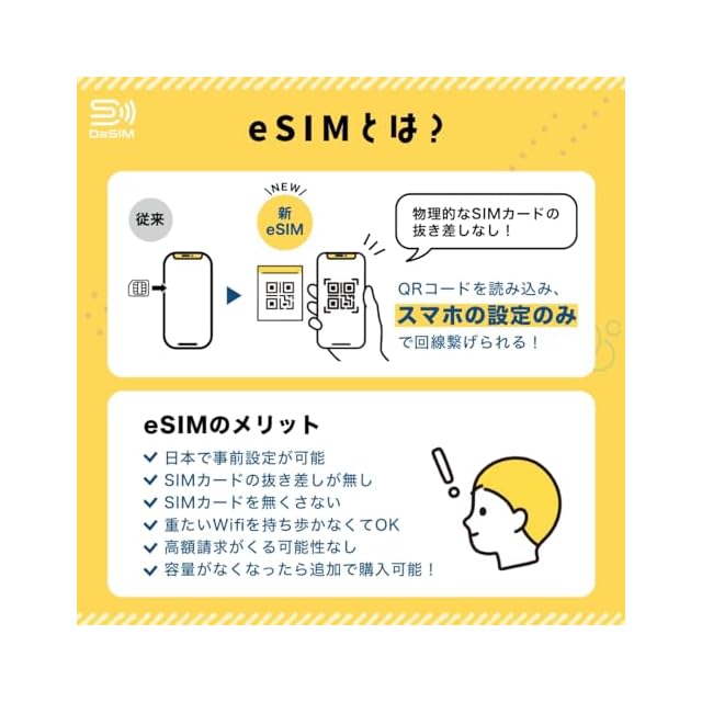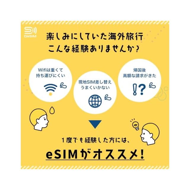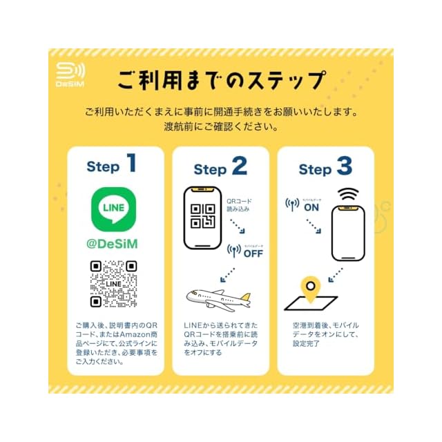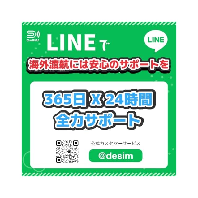 【設定簡単!】QRコードをスキャンして、簡単接続!✅QRコード交換:ご購入後、http://jp.desim.tech/ にアクセスし必要事項を入力→メールアドレスにPDFの説明書と設定用のQRコードが届きます! 【4G / LTE高速通信】高速インターネット通信可能! 手間要らずのSIMで快適な旅行を 【LINE日本語安心サポート】トラブルがあった場合もLINEで簡単問い合わせが可能!(主要問い合わせ時間:平日10時-19時) 【わかりやすい取扱説明書付き】取扱説明書もついているから、初めてのご利用でも安心! すぐ利用したい方:お急ぎのお客様はすぐご利用いただけるようご案内を致しますので、LINEでお問い合わせください。 注意事項①:電話番号は付与されませんので、ご注意ください。 注意事項②:SIMロックフリー端末、もしくはSIMフリー端末専用のサービスです。必ず、ご利用端末がeSIM対応かどうかご確認ください。 注意事項③:2021年10月1日以前にSIMロック解除をキャリア店頭またはインターネットでされた「Android端末」はご利用いただけない可能性があります。 こちらもし繋がらない場合、端末の問題により、 返品・返金等の対応は行っておりませんので、 事前にご確認の上、ご購入ください。 注意事項④:最新のOSバージョンでないと、ご利用いただけない場合がございます。事前にアップデートをお願いいたします。 注意事項⑤:本商品は、利用可能国および地域以外ではご利用いただけません。 注意事項⑥:回線状況により、エリアによって接続できない可能性もございます。エリア起因によるキャンセルはできませんので、ご了承の上ご購入ください。 注意事項⑦:利用有無に問わず一度削除したeSIMは、再インストールできません。また、一度読み込んだQRコードは他の端末で読み込むことができません。※万が一エラーとなった場合も削除せず、弊社カスタマーセンターまでお問い合わせください。 【返品等】当店では下記の内容につきましては対応できませんので、ご了承下さい。①ご購入後7日経過のSIM返品 ②SIMロック未解除による利用不可. ③パッケージ開封後のSIM返品. ④お客様設定ミスによるローミング料金