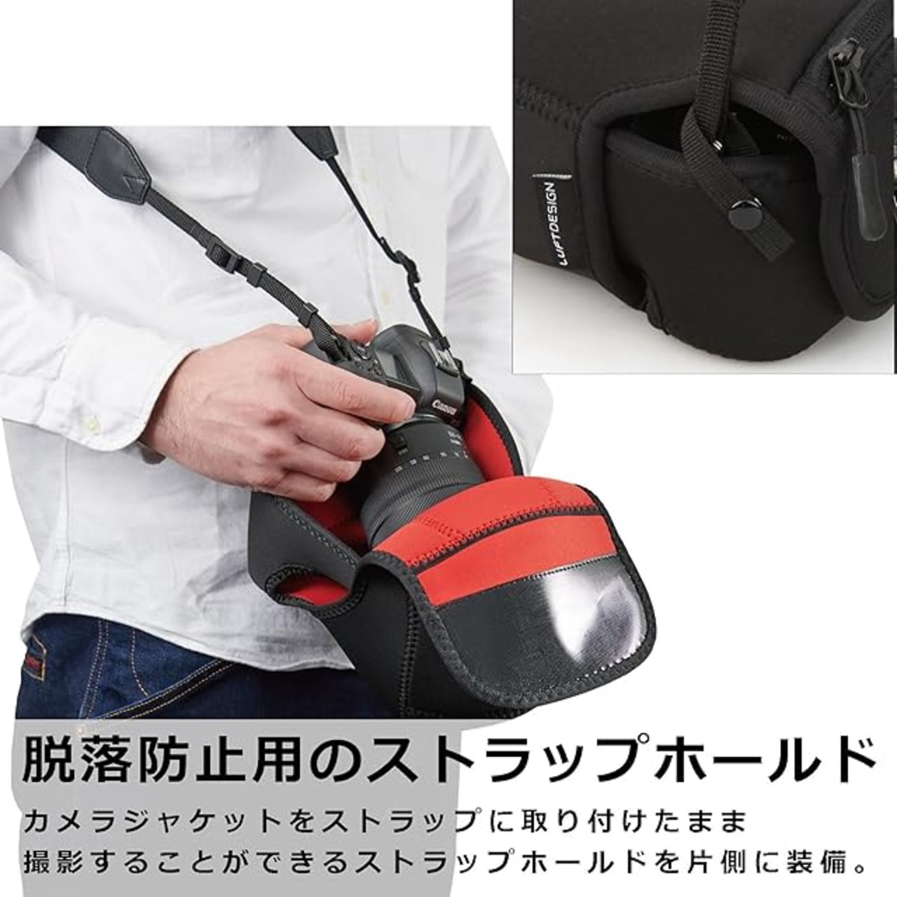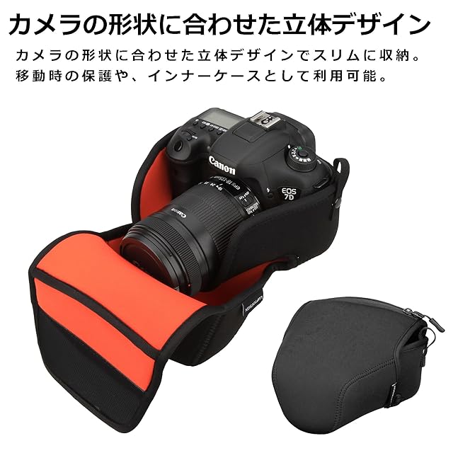 クッション性抜群、立体構造のカメラジャケット。伸縮性とクッション性に優れた素材が大切なカメラを守ります。