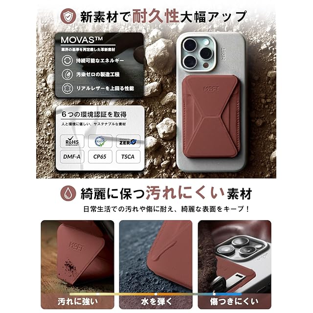 ✨【最新のヴィーガンレザー「MOVAS」採用!洗練されたスリムデザインで高耐久性】 「MOVAS」は、MOFTが誇りを持って開発したヴィーガンレザーで、その特長は一見の価値があります。この素材は驚くほど繊細な手触りを備えながら、同時に高い耐久性を持ち、さらには環境への優しさも追求しています。その結果、この素材を使用したスマホスタンドは、優れた張力と靱性を誇り、ポケットにキーホルダーやカードキーと一緒に収納しても傷がつきにくいのが特長です。洗練されたスリムデザインは、ユーザーに高級感をもたらし、日常のスタイリッシュな使い勝手を追求した結果として、このヴィーガンレザーのスマホスタンドは他と一線を画しています。