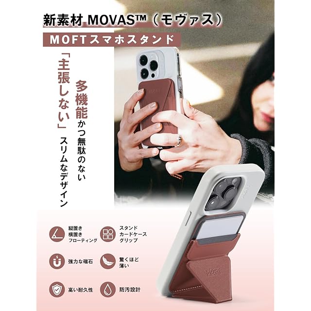商品名:MOFT スマホスタンド 【MOVAS™ 耐久&磁力強化版】 Snap-On iPhone 16 iPhone 15 iPhone14 iPhone13 iPhone12 MagSafe対応 傷や汚れに強い マグネット カードケース 最大2枚収納 iPhoneスタンド Pro Plus ProMax 磁石 磁気吸着 薄型軽量 折り畳み式 ミニマリスト サステナブル (シエナブラウン)