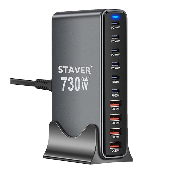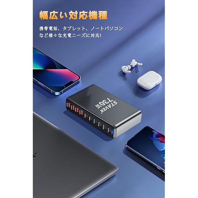 【10ポートで10台のデバイスを同時に急速充電】この充電器はUSB-Cポート×6、USB-Aポート×4の構成で、合計730Wのハイパワー出力を実現しています。10台のデバイスを同時に充電しても充電スピードが落ちることなく、真の「同時急速充電」を提供します。具体的な出力配分は、USB-C1(PD3.0 140W)+USB-C2(PD3.0 140W)+USB-C3(PD3.0 100W)+USB-C4(PD3.0 100W)USB-C5(PD3.0 65W)+USB-C6(PD3.0 65W)+USB-A1(QC 30W)+USB-A2(QC 30W)+USB-A3(QC 30W)+USB-A4(QC 30W)です。これにより、iPhone/Androidのスマートフォン、タブレット、Switch/Steam Deckなどのゲーム機、MacBook Proなどの高電力を必要とするノートパソコンなど、あらゆるデバイスを「同時急速充電」でサポートできます。