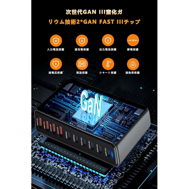 730W 充電器 【アップグレード版 GaNFastⅢ 10ポート 2*単口140W 1.5m電源ケーブル】PD3.0対応【PSE技術基準適合】 10ポート 2*140W常時対応 6USB-C&4USB-A 窒化ガリウム 複数ノート PCに急速充電対応 MacBook Pro PD対応 iPad/iPhone/Android/その他
