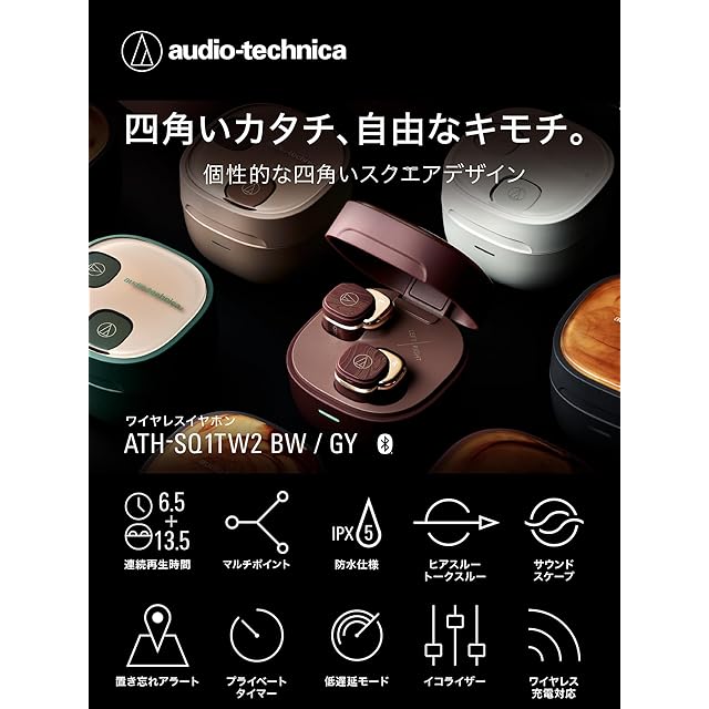 商品名:オーディオテクニカ ATH-SQ1TW2 GY ワイヤレスイヤホン Bluetooth マキアート模様 最大20時間再生 マルチポイント対応 小型軽量 アプリ対応 ヒアスルー 低遅延モード 急速充電 Qiワイヤレス充電対応 置き忘れアラート 防水 IPX5 チャコールグレー