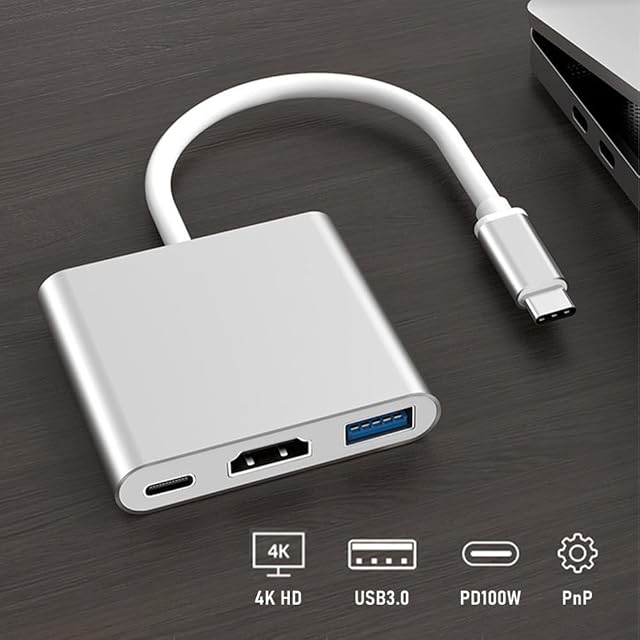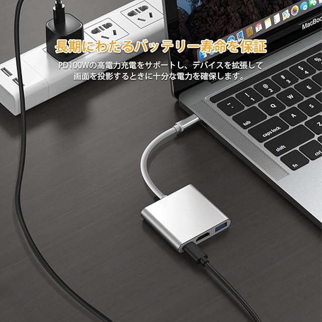 【3in1 Type-C to HDMI 変換アダプター】タイプc to usb 3.0ポート×1、4K HMDI ポート×1、PD充電ポート×1を搭載しています。HDMI対応モニター/プロジェクター/ TVと互換性があり、ビデオおよびオーディオ伝送が可能です
